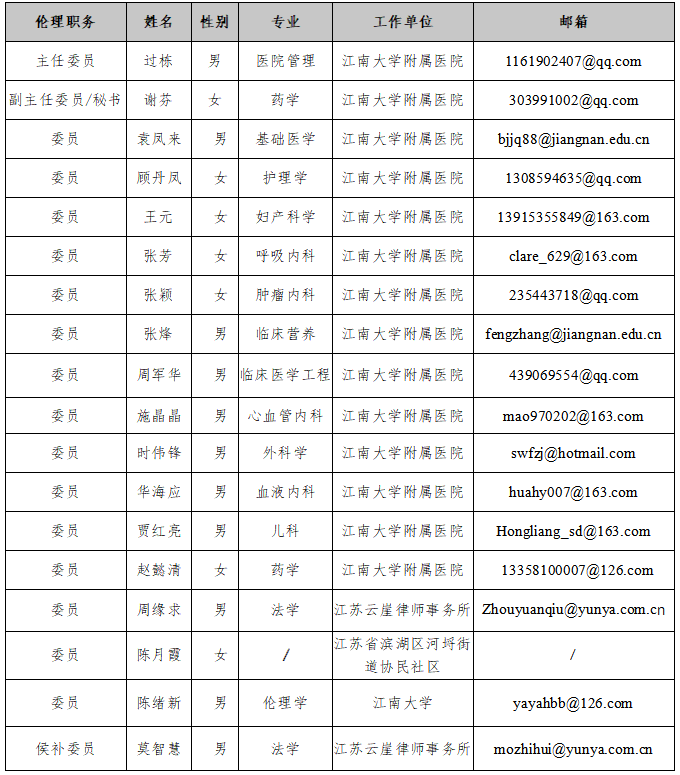 本伦理委员会设主任委员1名,副主任委员/秘书1名,其他委员15名,侯补委员1名。本伦理委员会是由不同性别的人员组成,其组成人员包括医药专业人员、非医药专业人员、伦理学、法律专家及与医院不存在行政隶属关系的外单位人员。